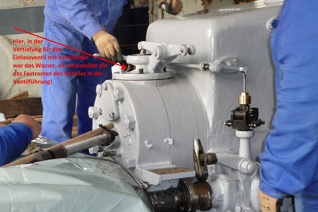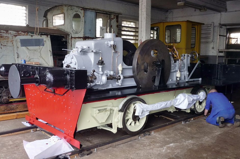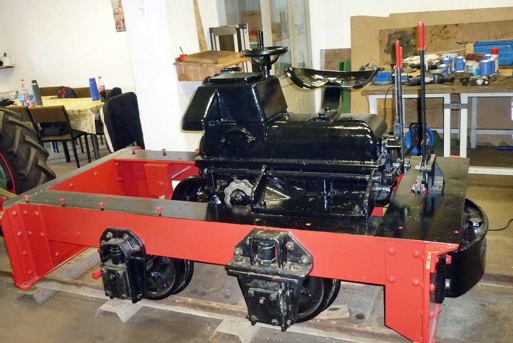 Alle weiteren Bauteile wie Motor mit offenem Kurbeltrieb, Getriebe mit offen liegenden Kupplungen, Wellen und Zahnrädern, das Fahrwerk mit den Treibstangen, die Tropföler für die Lagerstellen, der Vergaser und die Niederspannungs-abreißzündanlage konnten der Entrostung, Reinigung und Farberneuerung ausschließlich nur per Hand unterzogen werden um das sprichwörtliche "Sand im Getriebe" zu vermeiden.