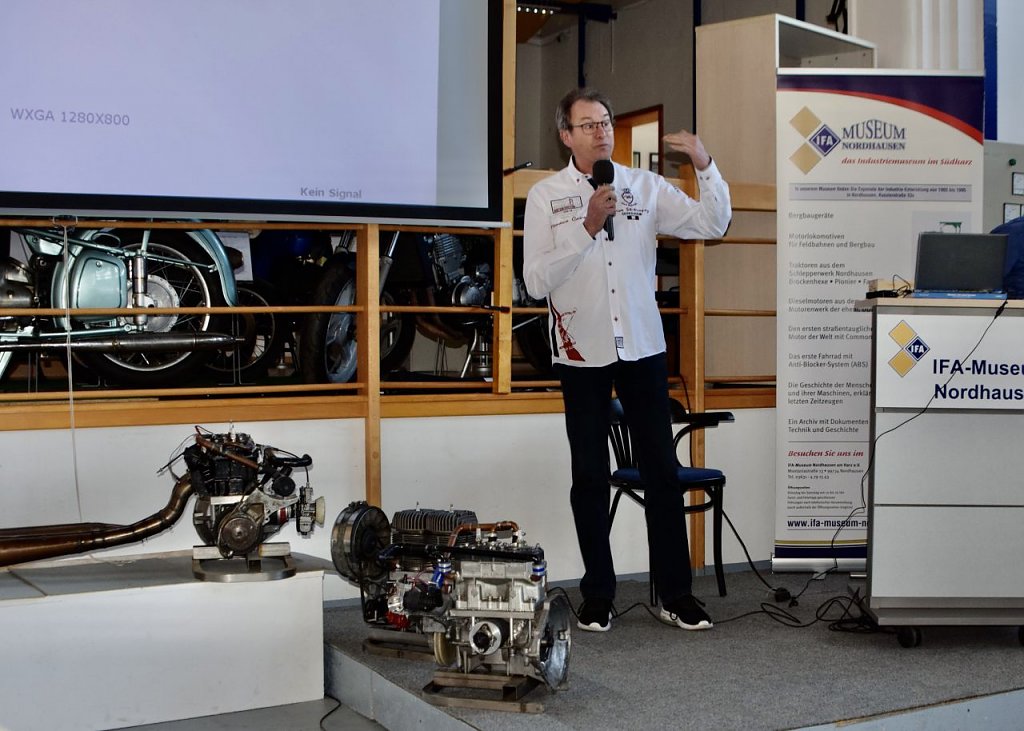 Am Ende kam ein weiterer Gast zu Sprache, Andreas Jacob hatte nicht nur sein Auto mitgebracht, sondern auch einige besondere Motoren. In seinem Beitrag berichtet er über neue Entwicklungen und welche Leistungen inzwischen aus diesen kleinen Motoren herausgeholt werden. Besonderheiten wie Auslassteuerung oder Resonanzschalldämfer ermögliche heute Leistungen über 100 PS.