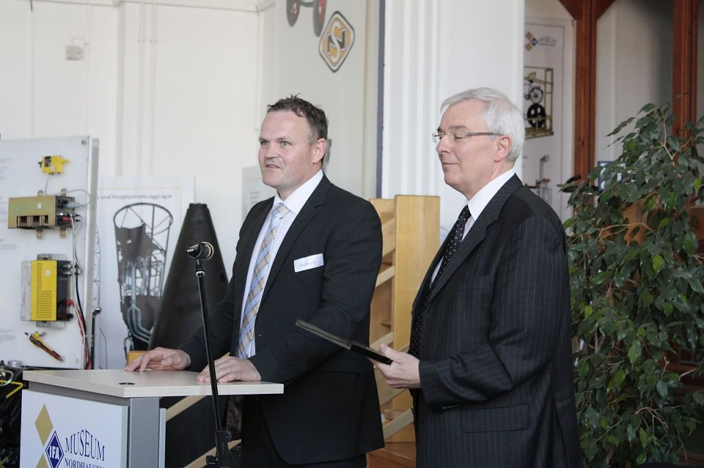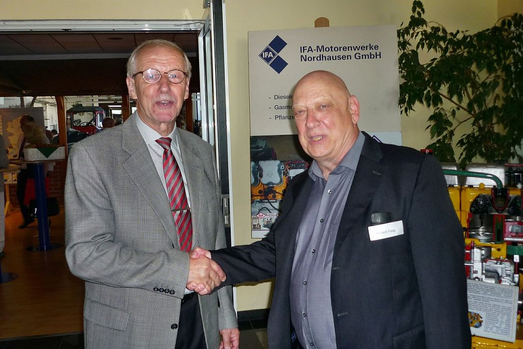 Als letzter Betriebsdirektor hatte Otto Brandt die IFA Motorenwerke Nordhausen von 1977 bis 1988 gelenkt und geleitet. Ihm oblag am Freitag das letzte Wort – als einem der wichtigsten IFA-Zeitzeugen. Nachdem er einen persönlichen Brief seines Vorgängers Robert Sternberger (1965 – 1977) verlesen hatte, erinnerte er an das tolle Team, das er einst um sich scharte: Es hatte Weltniveau. Und wenn ich daran denke, fallen mir Namen wie Sternberger, Schirrmacher, Beykirch, Steinmetz, Matthees, Jahn und viele weitere ein. Viele von ihnen bauten das Museum auf und sind heute hier. Sie beweisen, dass dieses Museum nicht nur ein Hobby älterer Herren und Damen ist, sondern sie stehen dafür, dass man die Eigenschaften der Nordhäuser Erzeugnisse aus den vergangenen 110 Jahren in die Welt tragen muss. Eine bessere Werbung kann man für das neue Industriegebiet nicht machen.