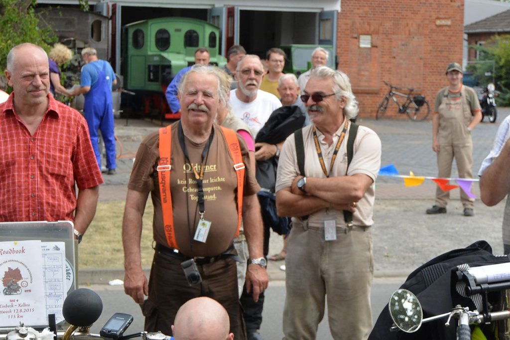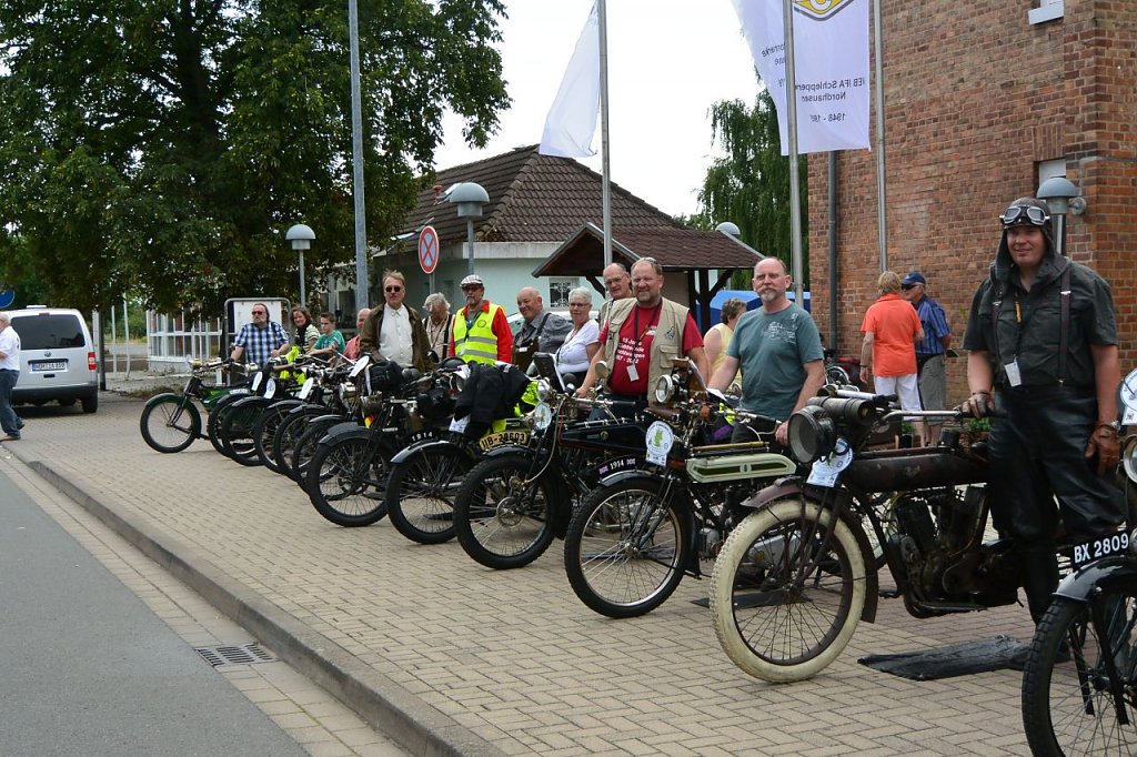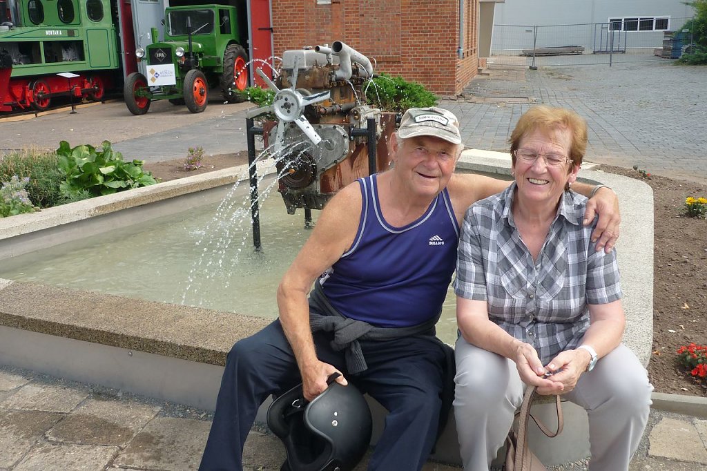 Eine kleine Stärkung, interessante Gespräche rund um alte Technik, ein Bild für die Presse und schon knatterten die Motorräder davon, zum Tagesziel nach Kelbra. Natürlich gab es zum Abschied nicht nur gute Wünsche sondern auch etwas „Motorenöl aus Nordhausen“ mit auf die Reise.