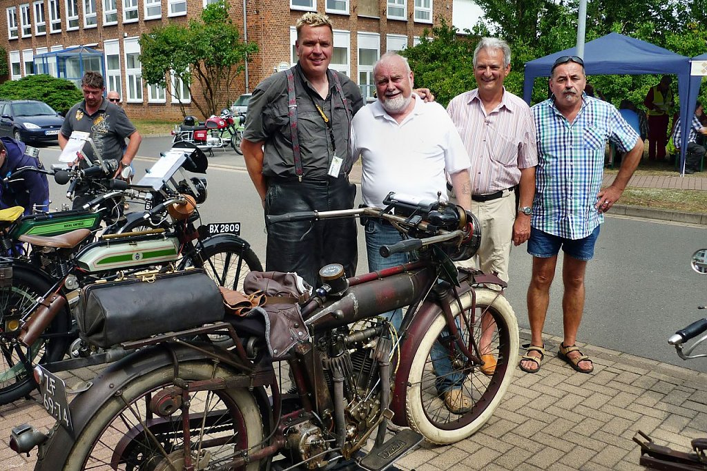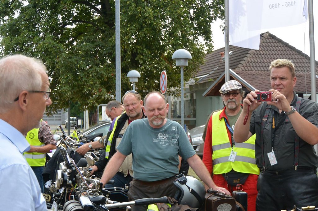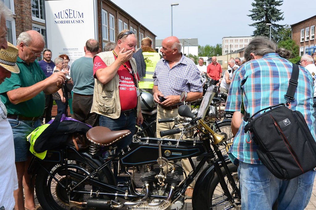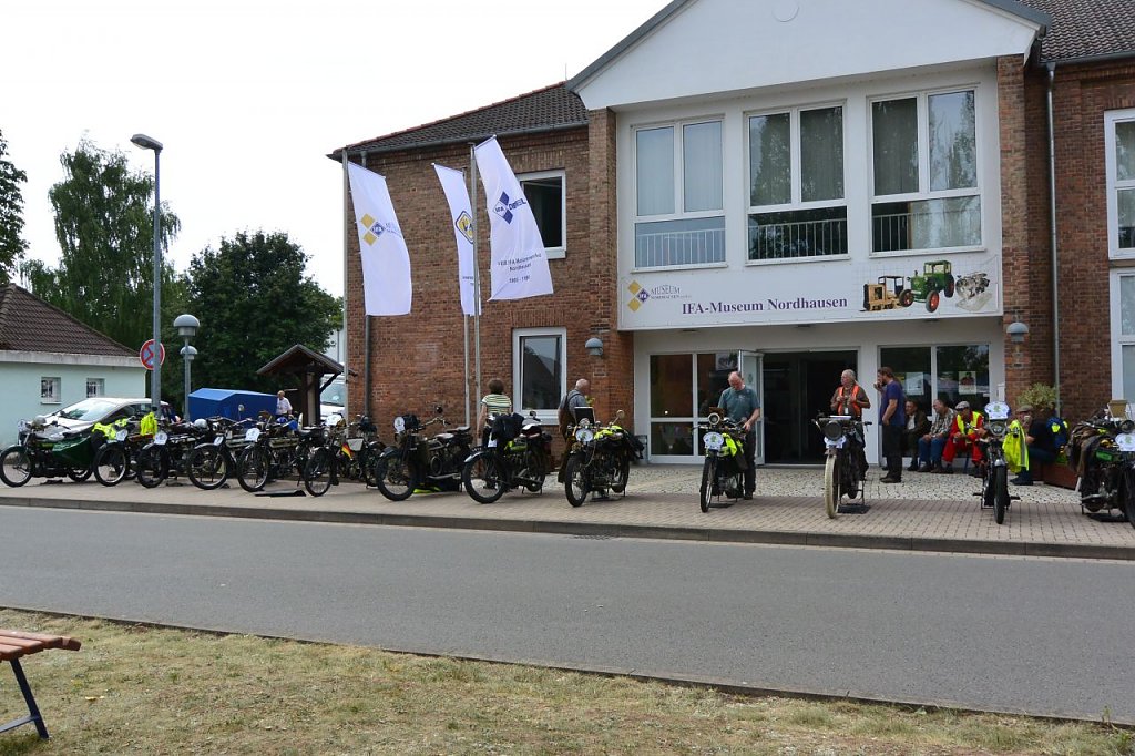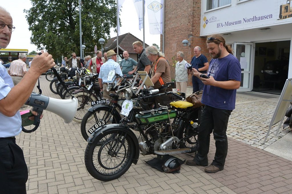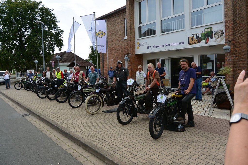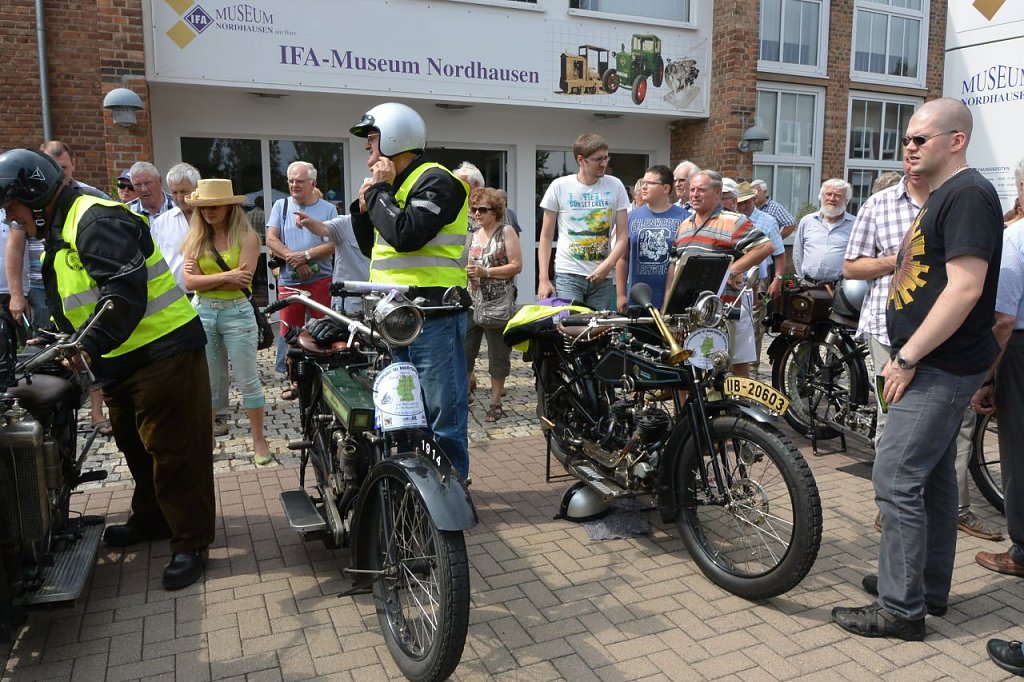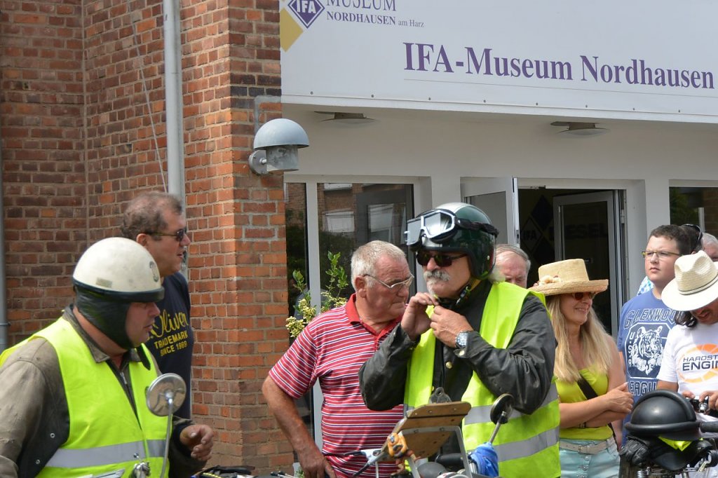 13 Mutige (Foto: hgf) 13 Mutige (Foto: hgf) Zeitungen und online Medien haben sie angekündigt und berichteten über die „Hundertjährigen“, die auf ihrer Fahrt quer durch Deutschland halt machten im IFA Museum Nordhausen. Mutige Fahrer auf Maschinen, denen man nicht nur ihr Alter ansieht, sondern auch die Liebe ihrer Besitzer. Maschinen mit offenem Herzen, jede Bewegung sichtbar und dem Geruch einer Zeit, die lange zurückliegt. Solche" Museumsstücke in Aktion" in unserem IFA-Museum präsentieren zu dürfen, erfüllte uns Vereinsmitglieder mit Stolz.