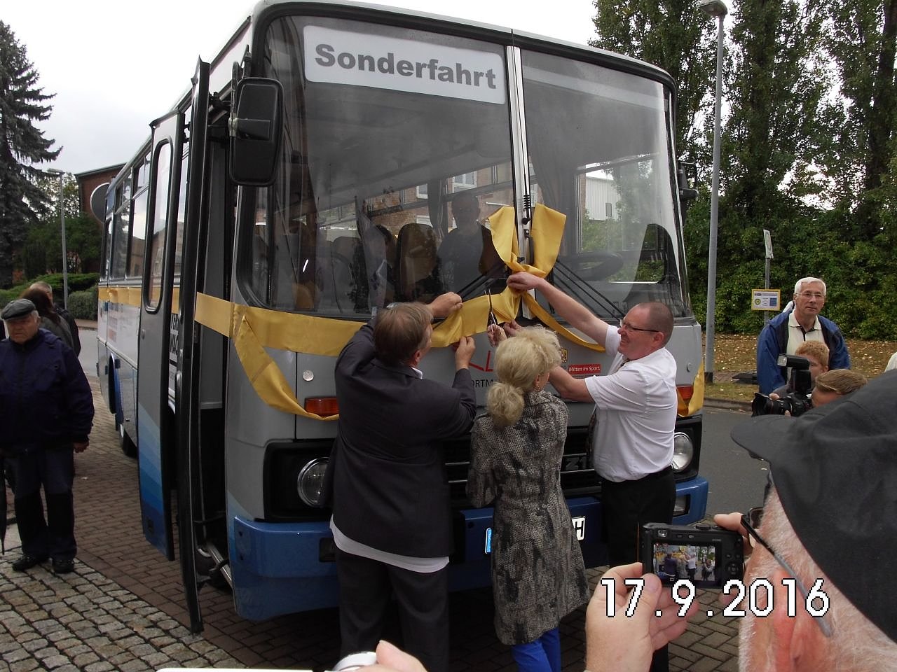Ein besonderer Glücksgriff war Herr Friedrich Johann Landmann, der im Rahmen des Bundesprogrammes Soziale Teilhabe am Arbeitsmarkt für den Verein tätig ist. Er hat unseren Bus unter Begleitung der DEKRA und des IFA-Museums liebevoll und akribisch aufgearbeitet. Wenn ich den Bus und Herrn Landmann täglich besucht habe, war sein Standardsatz: Herr Schwarz – ich brauche … immer wieder eine Handlungsaufforderung für mich weiter nach Unterstützern des Projektes zu suchen. Und es waren viele, die uns mit persönlichen Arbeitsleistungen, mit Ersatzteilen aus Privatbeständen, mit ihren Spezialkenntnissen und auch mit dem einen oder anderen Euro unterstützt haben. Wir bedanken uns nochmal bei den bereits erwähnten und bei der Mannschaft der Fahrzeuginstandhaltung der Verkehrsbetriebe Nordhausen, bei der Fa. Adapt – Herr Papst, bei Frau Schuchardt, Herrn Salomon, Herrn Mund, bei Herrn Meyer vom LK Sportmarketing sowie bei den Herren Teuerkauf und Hofer. Wir bedanken uns weiter bei der Fa. Metallbau Röger in Steinbrücken, bei Herrn Lischka von der Fa. Obermann, sowie bei den Herren Sorell, Husung und Körner. Ohne unsere Unterstützer wäre das Projekt weder zeitlich noch finanziell zu stämmen gewesen. Und sie können mir glauben, es war bis zum Schluss eine Zitterpartie. Noch am Tage vor der finalen Beratung zur Museumsnacht in der Flohburg mussten wir einen technischen Rückschlag hinnehmen. Ich habe zu Georg Franke gesagt: Was soll ich da morgen erzählen?. Georg sagte nur trocken: Thorsten du bist Chef von so vielen Leuten, du wirst doch wohl die Nerven behalten! Georg hat Recht behalten und ich meine Nerven.