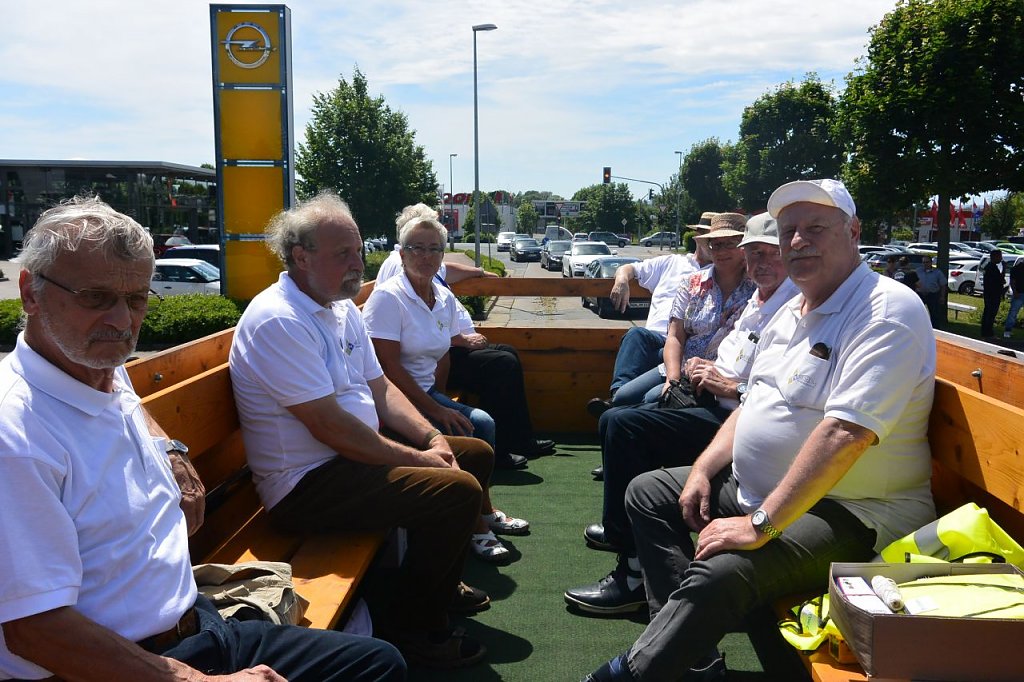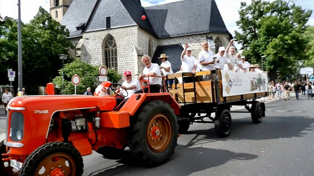 Am Stellplatz in der Leimbacher Str. hatten sich dann 22 Vereinsmitglieder, Freunde u. ein Enkel eingefunden. Unsere Plätze auf dem Festwagen waren also gut besetzt und es konnte losgehen. Der „Blaue“ führte Bild 16 – Gute Verbindungen u. saubere Stadt – an. Leider das letzte Bild im Zug und wie zu erwarten war, verzögerte sich der Start. Unser Bedenken nur noch müde Zuschauer vorzufinden, bestätigten sich nicht. Von Anfang an säumte eine dichte Menschenmenge die Fahrstrecke. Für die Fahrer der Festwagen keine leichte Aufgabe, nicht die ständigen Stockungen waren das Problem sondern die immer wieder nach den Streuartikeln suchenden Kinder. Also nicht die am Rand stehenden bekannten Gesichter begrüßen, sondern die immer wieder in die Spur laufenden Besucher nicht überfahren. Am Ende ging alles gut und alle waren zufrieden.