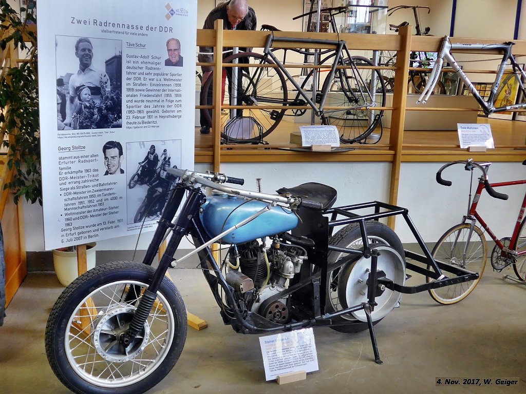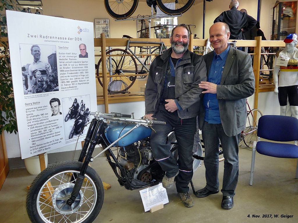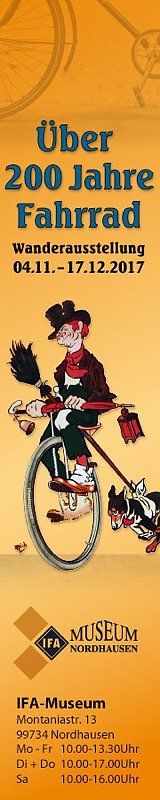 In der Eröffnungsrede bedanke sich der Vereinsvorsitzende bei allen Freunden und Partnern für die ausgezeichnete Zusammenarbeit. Ohne die Arbeit der vielen Helfer wäre die Ausstellung nicht möglich. Dank der Unterstützung durch die Mitglieder in den Vereinen, von befreundeten Museen und der Hilfe der Sammler historischer Fahrräder wurde es möglich, die stattliche Anzahl von über 60 Rädern und weit über 130 Sammlerobjekten aus dem vielfältigen Zubehör zusammenzutragen. Neben Rädern aus vergangener Zeit stehen moderne Hightech Fahrräder. Einige Exemplare sind die letzten ihrer Art. So geben besonders die sagenumwogenen Räder der DDR Bahn- und Straßensportler einen Einblick in die Rennsportgeschichte der 60iger und 70iger Jahre. Die Fahrradhändler der Region stellen sich mit aktuellen Spitzenprodukten vor und zeigen neue Entwicklungen der Technik. So findet der Besucher das Schnittmodell einer 14 Gang Nabenschaltung oder eines neuen Tretlagergetriebes. Die junge Firma MÖVE Bikes aus Mühlhausen will damit die Leistungsausbeute des Fahrers um ca. 30 % verbessern. Ein Ziel der Ausstellung ist es zudem, die Leistungen und Erfolge regionaler Sportler im Endurosport und im Triathlon zu präsentieren. Geplant sind mindestens zwei Vortragsveranstaltungen in denen sich Spitzensportler mit ihren Sportgeräten vorstellen. Die Termine werden noch in der Presse veröffentlicht. Für die Dauer der Ausstellung ist das Museum Montag bis Freitag von 10-13:30 und Dienstag und Donnerstag bis 16:00 und jeden Samstag bis 16:00 Uhr geöffnet. Es gelten die üblichen Eintrittspreise. Wir freuen uns auf Ihren Besuch.