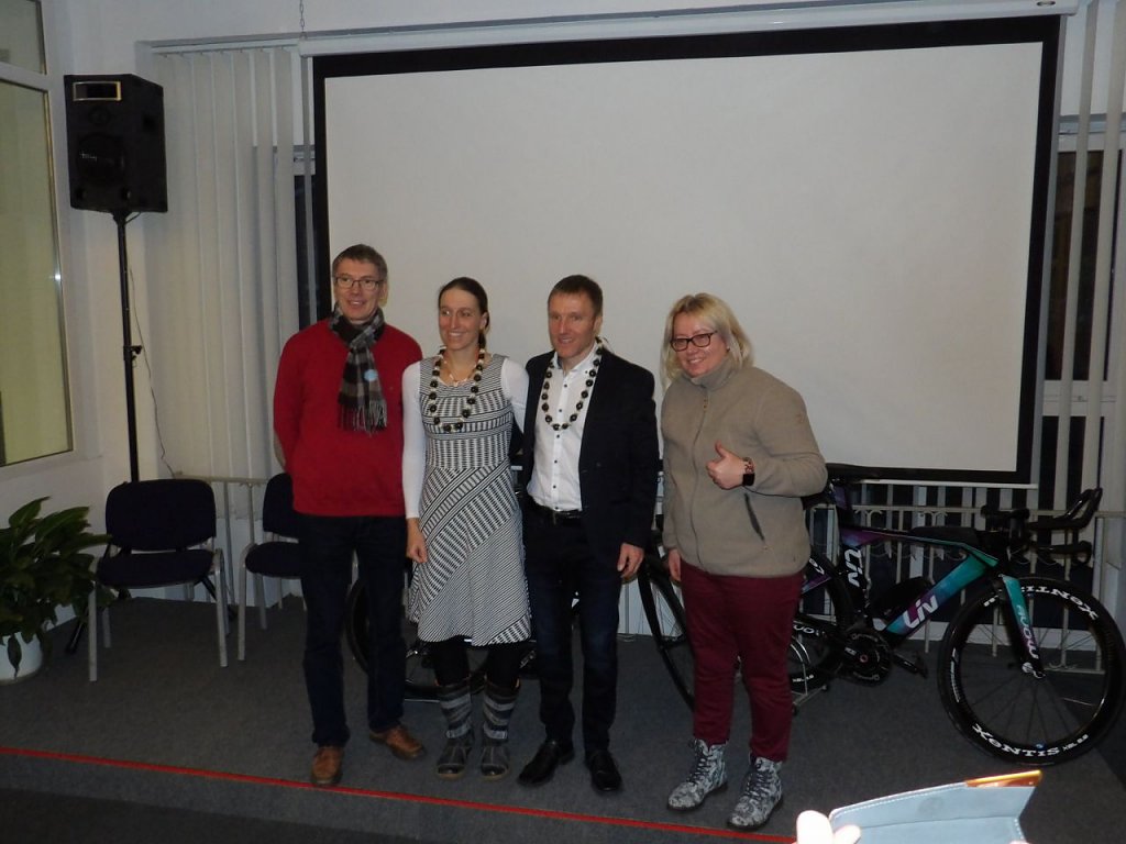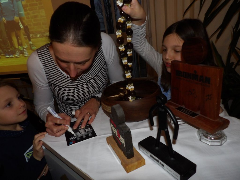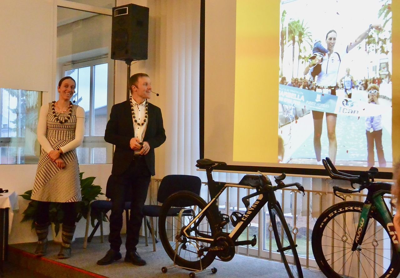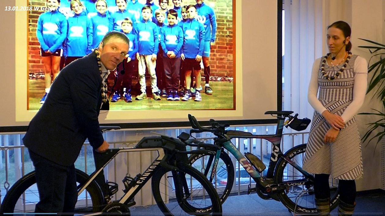 Untersetzt mit einprägsamen Bildern und den Geschichten aus eigenem Erleben erfuhren die Zuschauer, wie sich der Triathlon von den Anfängen bis in die heutige Zeit entwickelt hat. Den Kampf im Wasser gegen die dicht gedrängten Schwimmer über die einsame Jagt auf dem Rad bis zum die letzten Kräfte zehrenden Lauf in sengender Hitze gegen den Wind, all das macht den Ironmann auf Hawaii zu etwas Besonderem. Auch wenn es inzwischen viele Rennen gibt, die Weltmeisterschaft findet auf Hawaii statt. Die 1.500 besten Triathleten kämpfen nicht nur um den Sieg sondern auch darum dabei zu sein und das Ziel zu erreichen. Über 7.000 Helfer reisen aus der ganzen Welt an, um ihre Athleten zu unterstützen. Ulrich Konschak beschreibt anschaulich in seinem Vortrag die Besonderheiten der Streckenführung, seine Kontrahenten, die Entwicklung der Technik und die besondere Taktik solche langen Distanzen zu absolvieren. Begleitet von Kaja Konschak nahm er die Zuhörer mit ins Wasser und auf die Straße, erklärte, was sie beachten müssen und wie sie sich das Rennen einteilen, um im Limit das Ziel zu erreichen. Wo er stockte, führte sie fachkundig weiter.