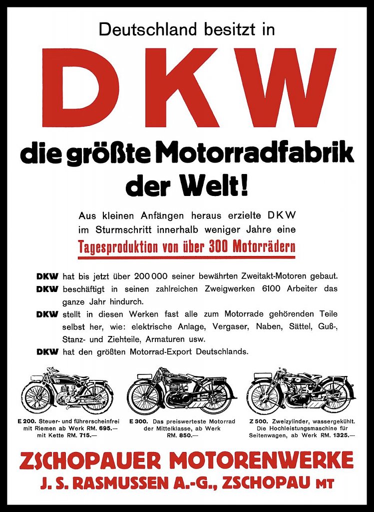 Mit den DKW-Zweitaktmotoren kam auch Ende der 1920er Jahre der Einstieg in den Pkw-Bau. Mit den später im Zwickauer Audi-Werk produzierten preiswerten DKW Frontwagen begann in den 1930er Jahren die Volksmotorisierung in Deutschland. Der legendäre Trabant basierte bis 1990 auf diesen damals entwickelten technischen Prinzipien.
