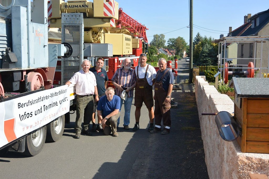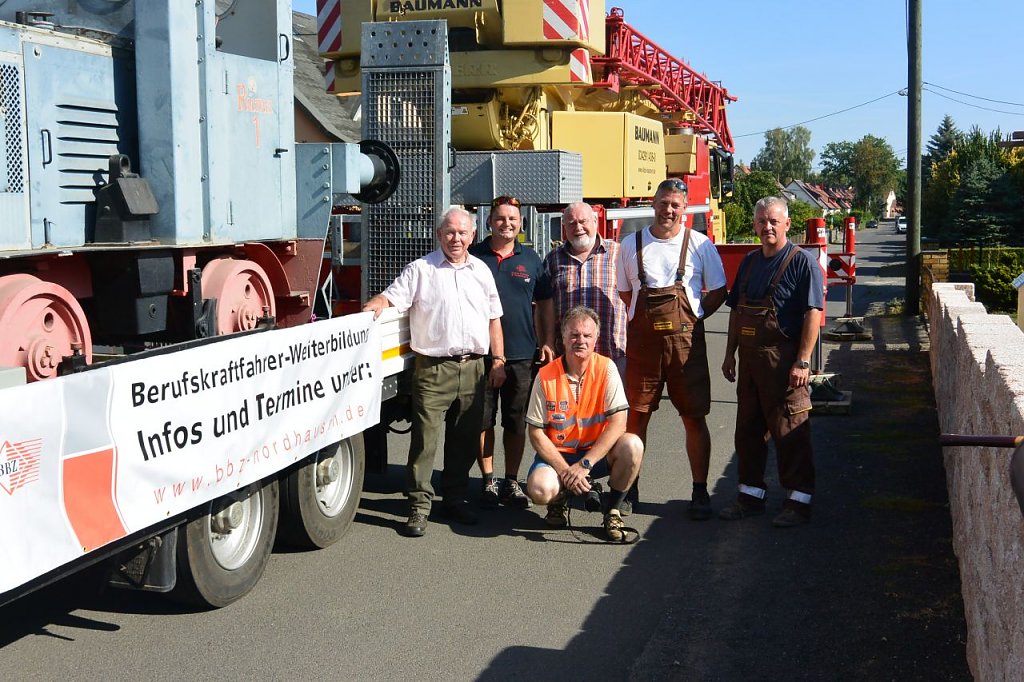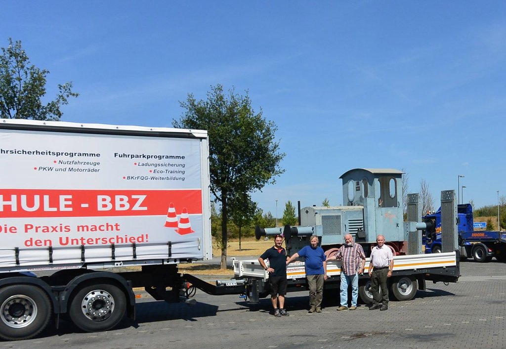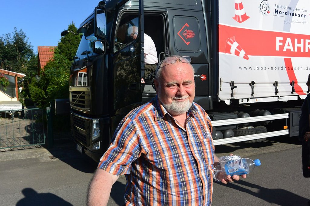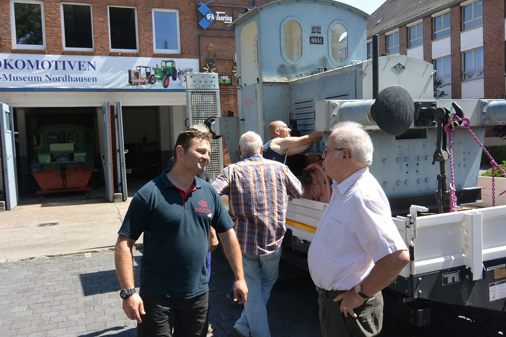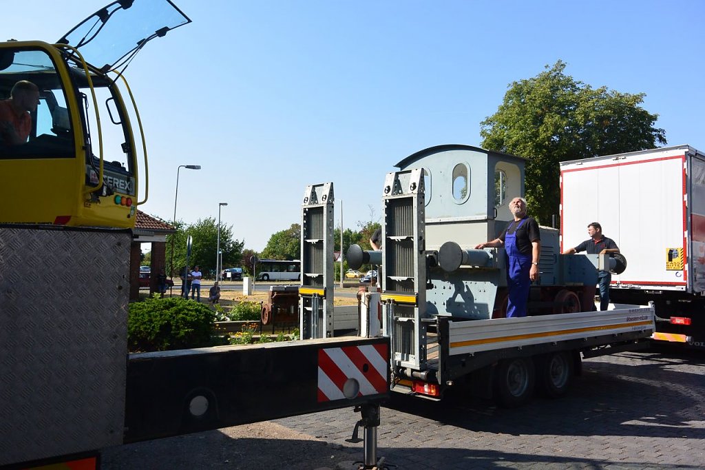 Abfahrt mit dem Fahrschulwagen des Berufsbildungszentrums Nordhausen am 26.07. 18 gegen 06:00 Uhr. Marcus Domann, unser Taxifahrer, hatte alles gut vorbereitet und Otto Brand und Wilfried Geiger klemmten sich ins Fahrerhaus. Bei der Ankunft fand sich ein schon aufgeregter Volker Lange, der die Verladung akribisch vorbereitet hat, Genehmigungen eingeholt, den Kran geordert, Stellflächen frei gehalten etc. Es fehlte nichts, nur der Kran. Aber auch der ließ nicht lange auf sich warten und schob sich rückwärts auf den vorgesehen Standplatz.