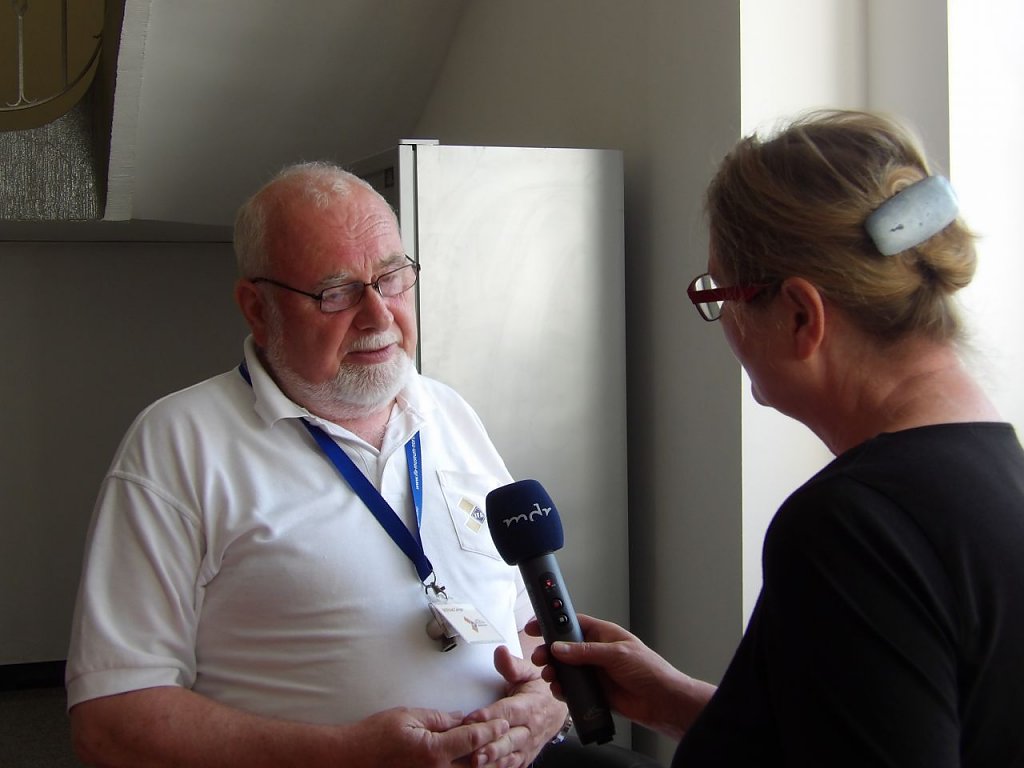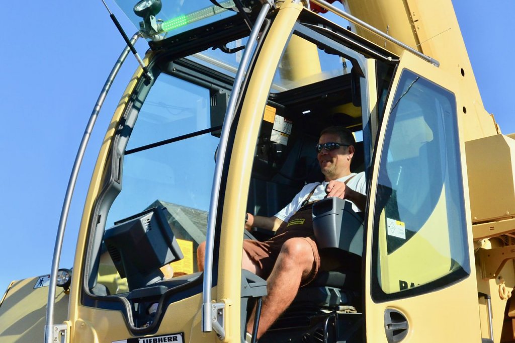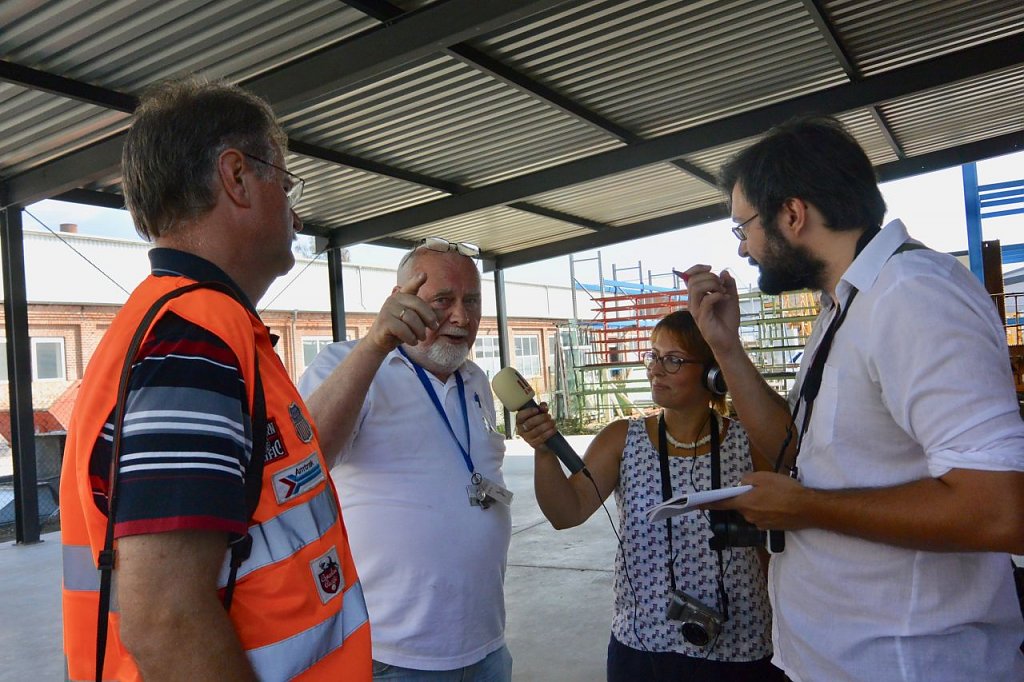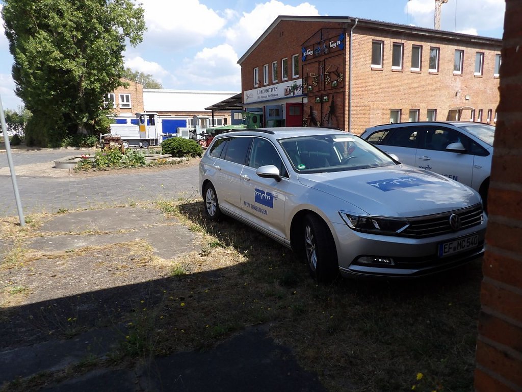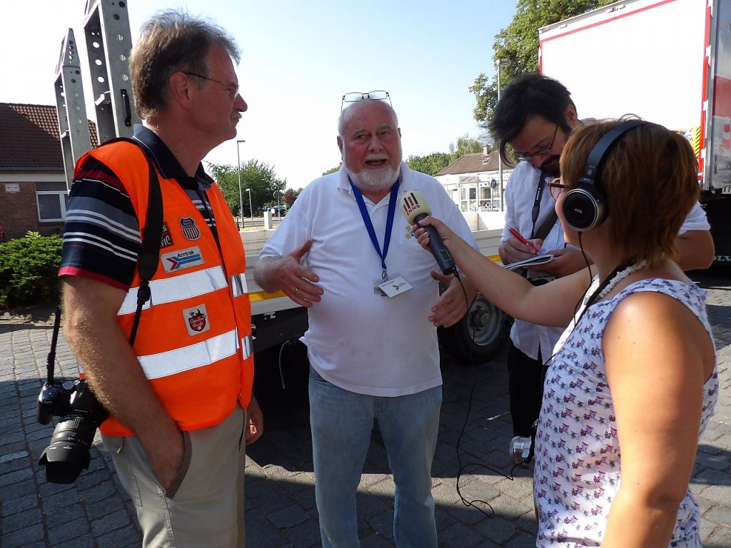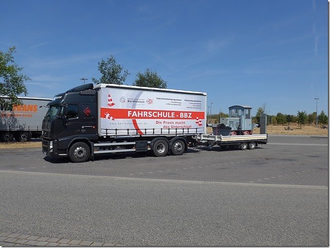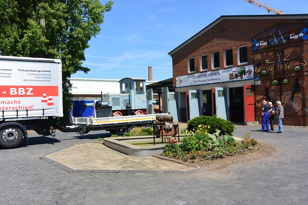 Abfahrt mit dem Fahrschulwagen des Berufsbildungszentrums Nordhausen am 26.07. 18 gegen 06:00 Uhr. Marcus Domann, unser Taxifahrer, hatte alles gut vorbereitet und Otto Brand und Wilfried Geiger klemmten sich ins Fahrerhaus. Bei der Ankunft fand sich ein schon aufgeregter Volker Lange, der die Verladung akribisch vorbereitet hat, Genehmigungen eingeholt, den Kran geordert, Stellflächen frei gehalten etc. Es fehlte nichts, nur der Kran. Aber auch der ließ nicht lange auf sich warten und schob sich rückwärts auf den vorgesehen Standplatz.