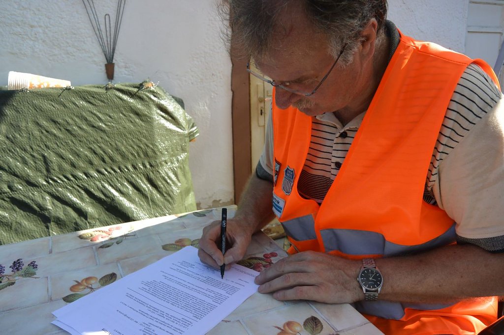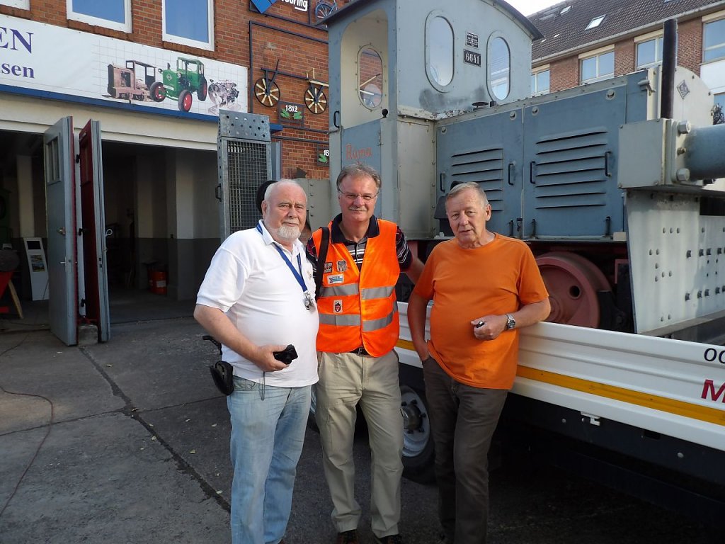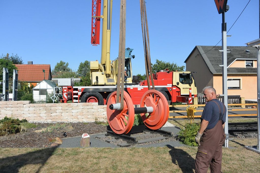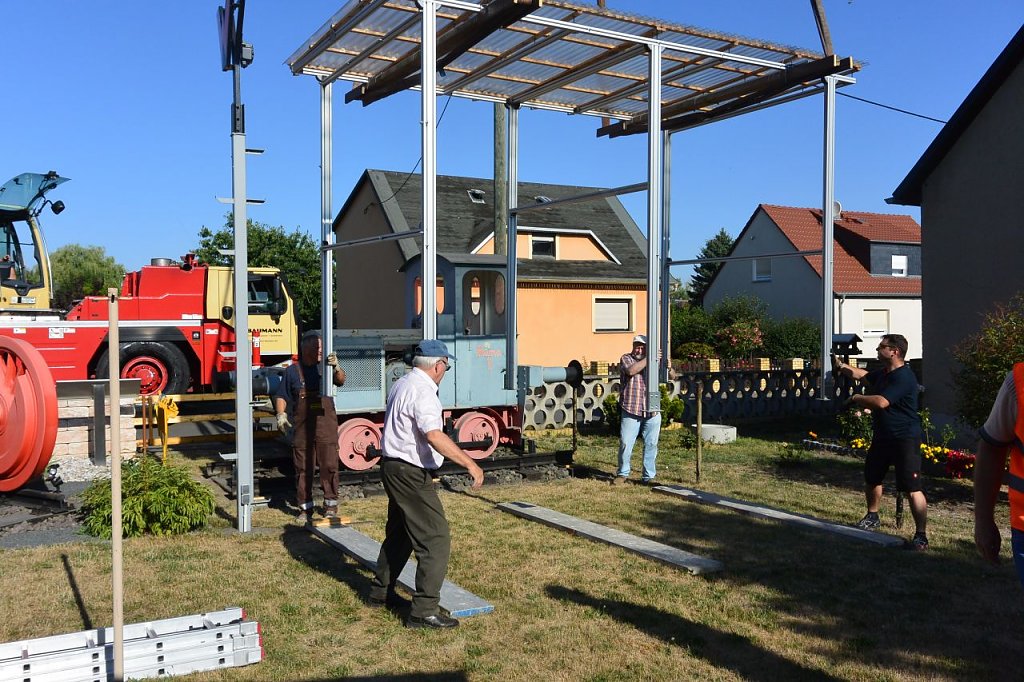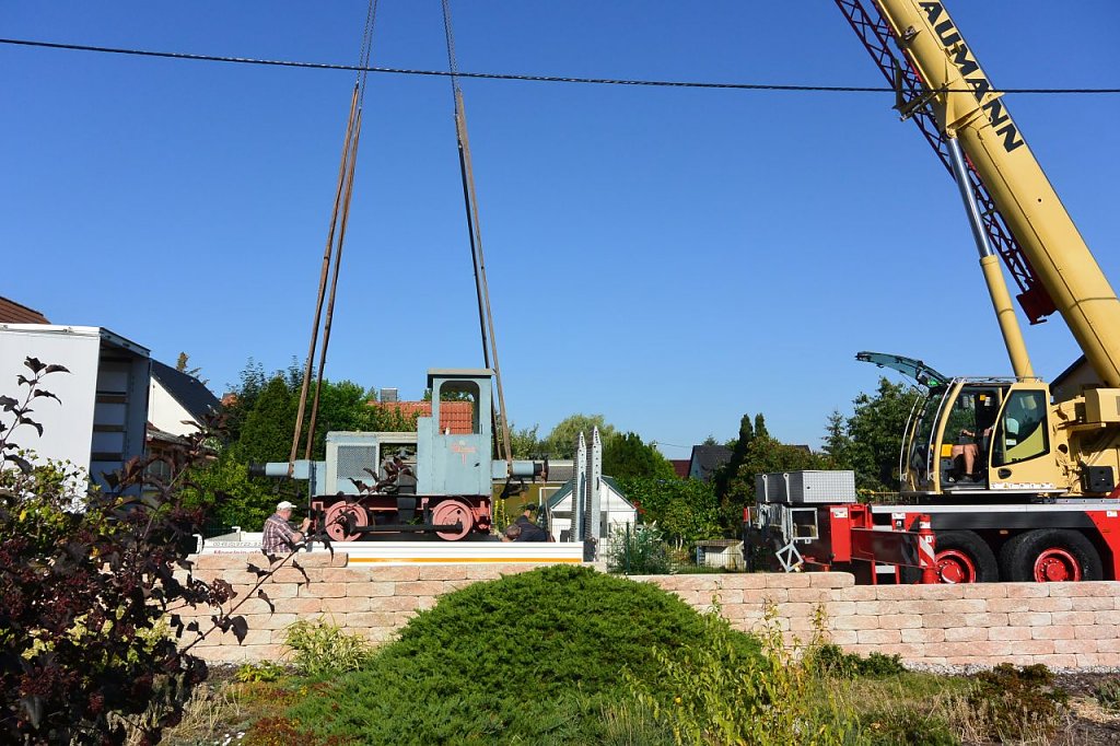 Kurze Begrüßung, Einweisung in die Aufgaben und schon ging alles nach Plan. Zunächst musste allerdings das Wetterdach versetzt werden, aber auch das war vorbereitet. Der Autokran hatte leichtes Spiel. Dem Besitzers am Hebel seiner Maschine machte es sichtlich Spaß, die Lock hoch über die Dächer von Großpösna auf den Transportanhänger zu setzen. Was fehlte, war die Unterschrift unter den Schenkungsvertrag und ein Gruppenbild. Danach ging es ab nach Hause. Zurück blieb ein sichtlich bewegter Volker Lange, der wie er später sagt, sich erst daran gewöhnen muss, nicht mehr von seiner Lok begrüßt zu werden, wenn er nach Hause kommt.