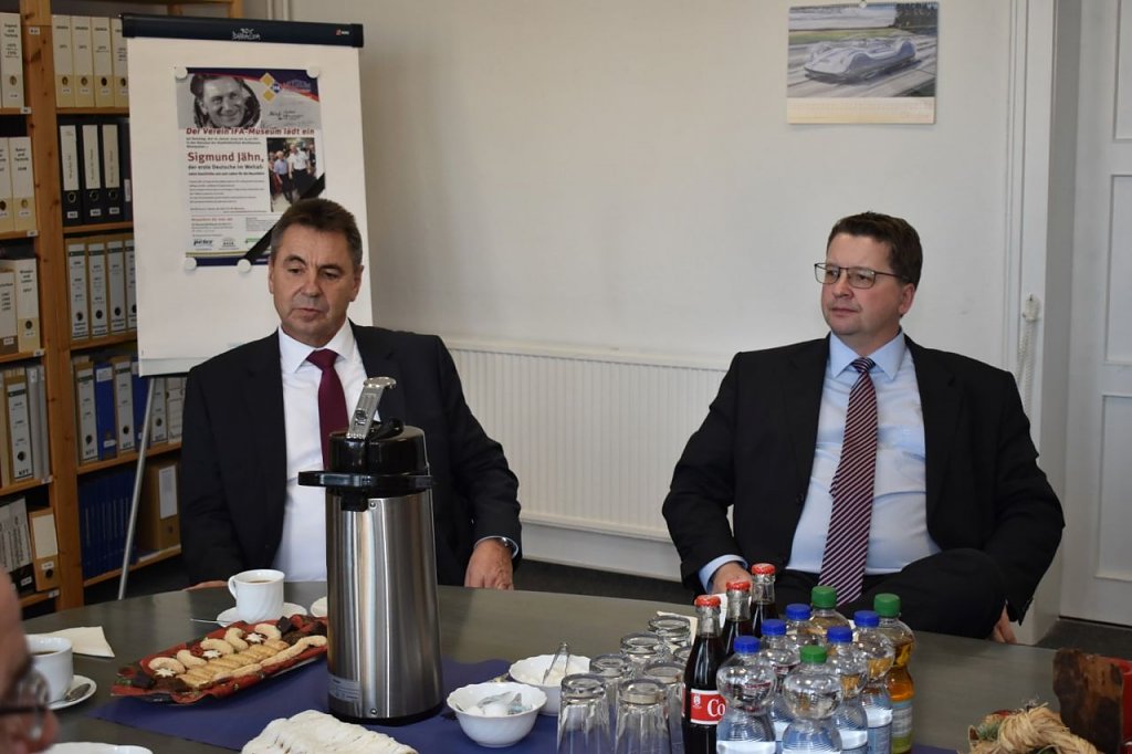 Nach einem sehr angenehmen Erfahrungsaustauch übergaben der Stiftungsvorsitzende Wolfgang Asche und der Landrat des Kreises Nordhausen Mathias Jendricke den Check an den Vorstand des Museumsvereins.