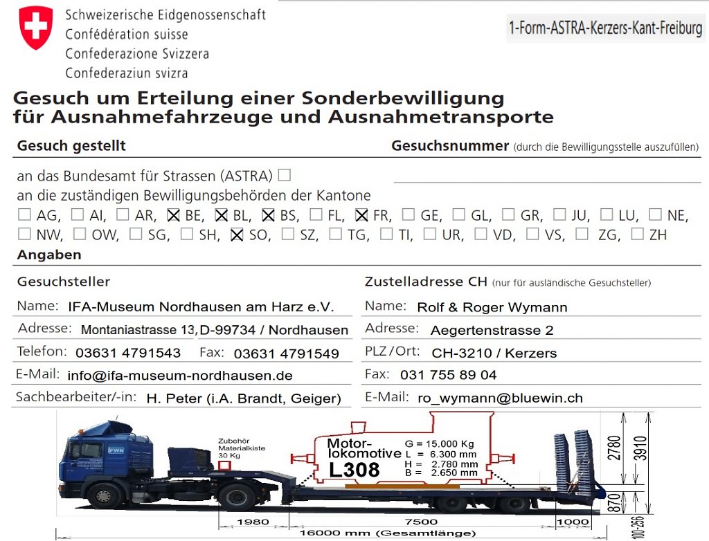 Die Genehmigungen für Schwerlasttransporte und Überbreite, sowohl für Deutschland, als auch für die Schweizer Kantone Bern und Freiburg mussten erarbeitet und eingeholt werden.