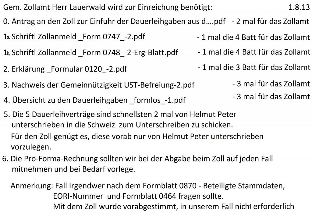 Von Anfang Juli 2013 bis zur Fahrt am 9. September habe ich praktisch in Tag- und Nachtarbeit die Ausnahmegenehmigungen hinsichtlich Zollfreistellung für Gegenstände gemeinnütziger Art mit erzieherischem, wissenschaftlichem oder kulturellem Charakter und die Genehmigungen für die Einfuhr zusammengetragen.