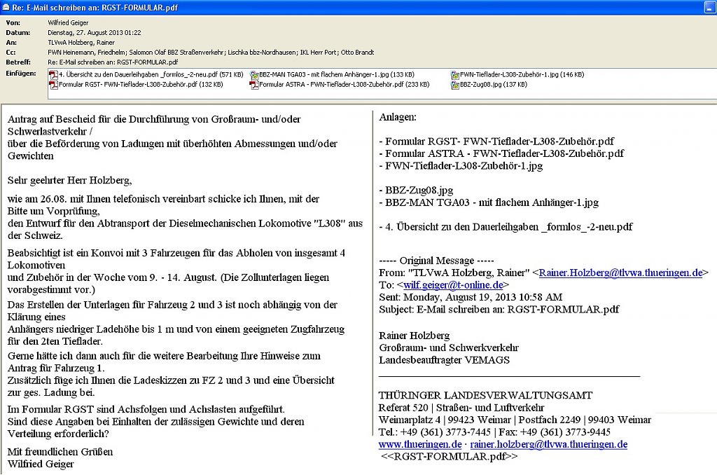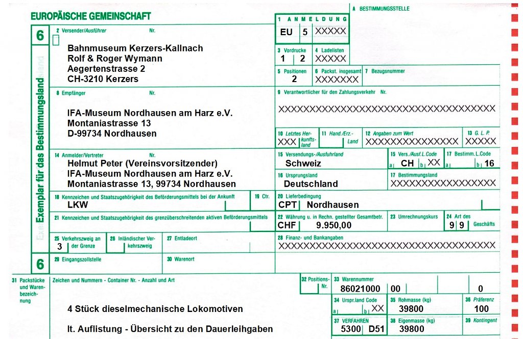 Der 1. dicke Hund, 20 Jahre Vertragslaufzeit für Leihgaben hat der Schweizer Zoll nicht akzeptiert, höchstens 2 Jahre und 2 mal 1 Jahr Verlängerung. Da hätten wir die Lokomotiven am besten gleich wieder zurückgebracht. Die Rettung, der Senior des Deutschen Zoll hat sich für uns verwendet und es wurde ein Ausfuhrdokument erstellt. Möglich war das nur weil der Eigentümer, Rolf Wymann persönlich anwesend war.