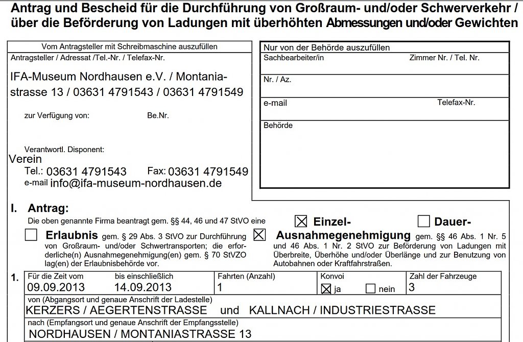 Endlich hatten wir alle Dokumente zusammen. Am Montag, den 9. September standen auch die Schwerlasttransporter der Fahrzeugwerke Niedersachswerfen, der Spedition Otto und der LKW des BBZ mit Anhänger von Henning-Bau bereit. Das Abenteuer konnte beginnen!