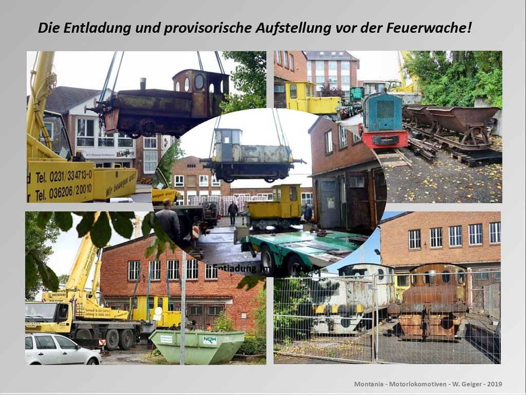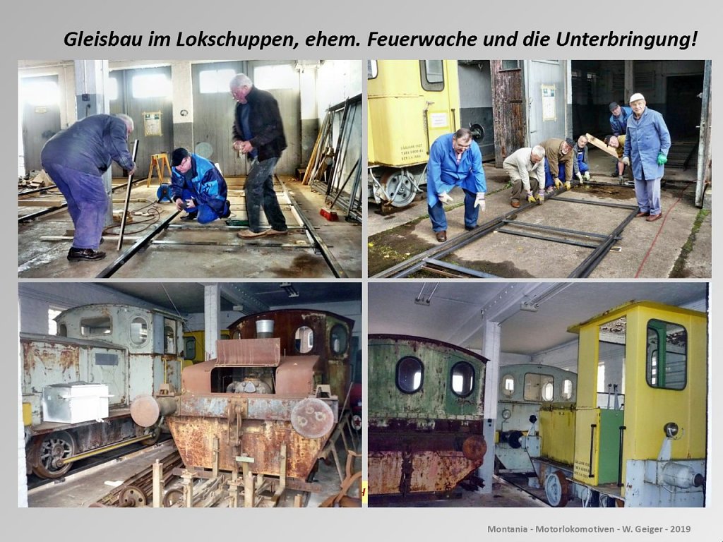 Um es kurz zu machen, die 4 Lokomotiven wurden im Lokschuppen, der ehem. Feuerwache ins Trockene gebracht. Zuvor mussten mit Hilfe der Vereinsfreunde Hilfsschienen installiert werden.
