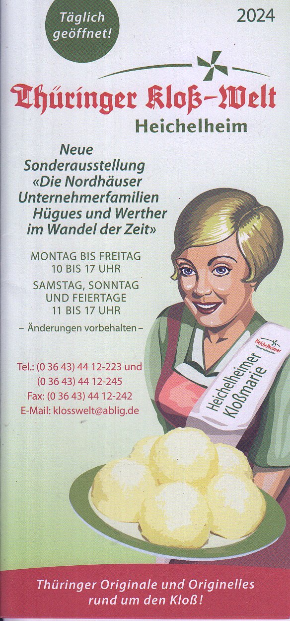 Ein Besuch in der Kloß-Welt Heichelheim lohnt sich immer, ob man gute Thüringer Nationalgerichte wie den original Kartoffelkloß sucht oder sich mit der Geschichte seiner Entstehung vertraut machen möchte, die Kloß-Welt ist immer eine Reise wert. Seit langen gibt es auch eine sehenswerte Präsentation zum Fahrzeugbau in Mitteldeutschland, Wartburg, Trabant, Barkas, Simson und natürlich die Schlepper aus Nordhausen findet der Besucher in einer Dauerausstellung. Im Hofladen gibt es eine Vielzahl von Produkten aus regionaler Produktion. Was vielen nicht bekannt ist, in Heichelheim wird auch die Nordhäuser Eistradition fortgesetzt.