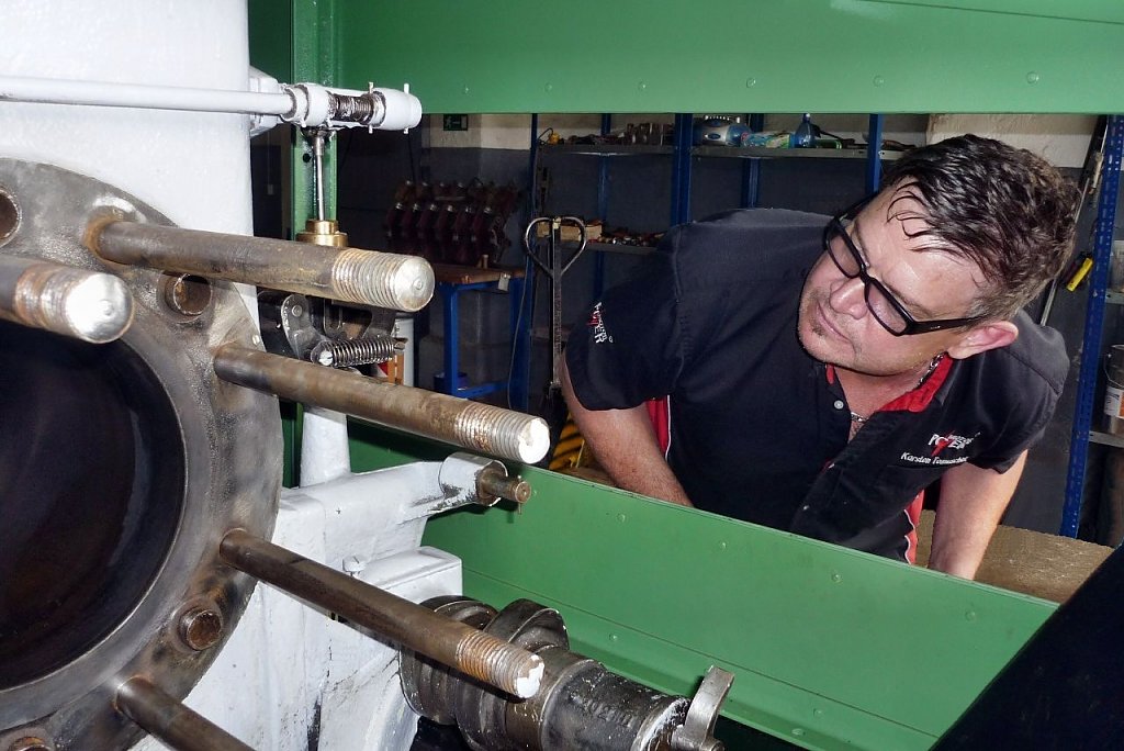 Im Bild sehen Sie Karsten Tomuschat, Chef von Motorpower Nordhausen, der bereits den Motor der Feldbahnlokomotive RL1c zum Laufen brachte, beim Begutachten des Defektes.
