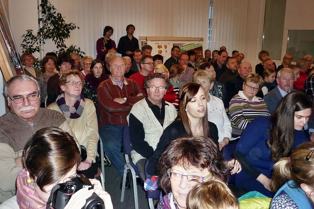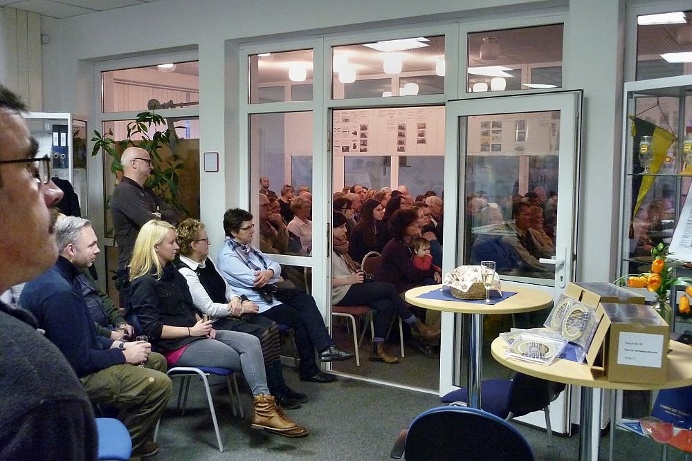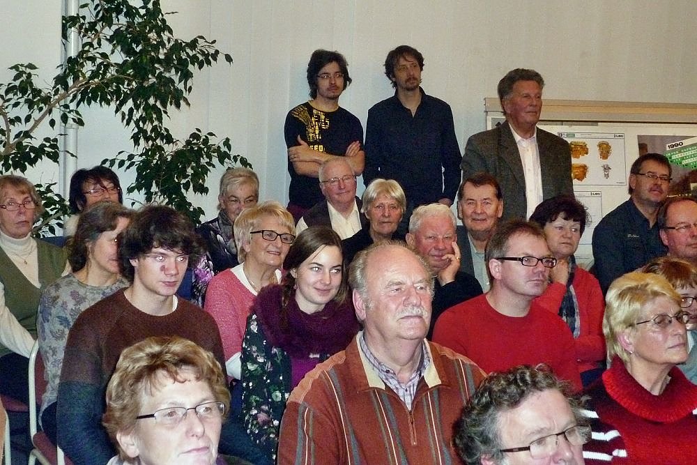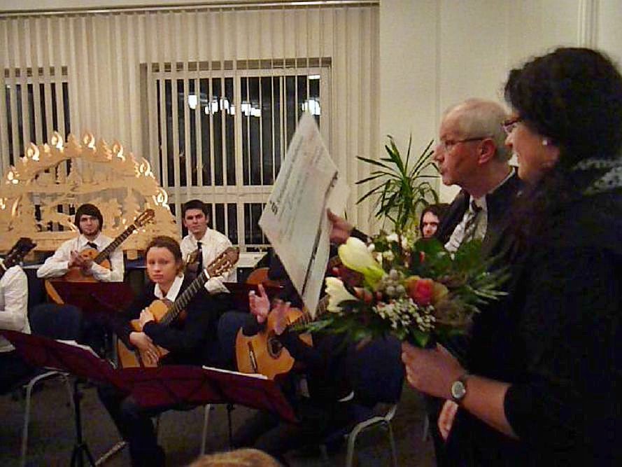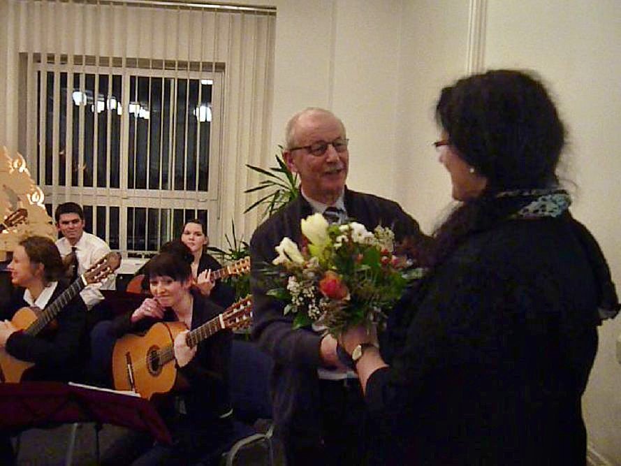 Die Sitzplätze und auch die Plätze zum Stehen reichten nicht aus (leider konnten einige Zuhörer die Darbietungen nur vom Vorraumaus verfolgen), es waren wohl mehr als 100 interessierte Liebhaber von Gitarrenmusik gekommen, um sich von der Musik verzaubern zu lassen. Sie alle durften einen faszinierenden Ohrenschmaus erleben, der noch lange nachschwingen und in Erinnerung bleiben wird. Der Vereinsfreund Achim Port überreicht Blumen und ein Scheck als Dank.