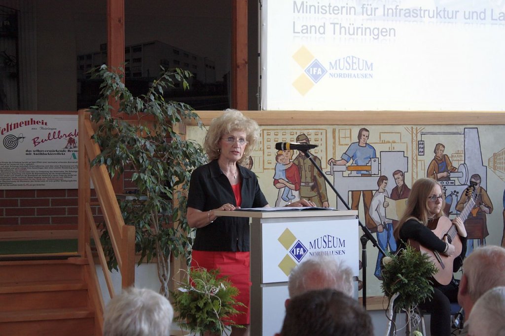 Nachdem Vereinsvorsitzender Helmut Peter die letzten 25 Jahre Revue passieren ließ und vor allem die Entstehung des IFA-Museums geschildert hatte, ergriff Infrastrukturministerin Birgit Keller das Wort und betonte: Ich würde Ihnen heute lieber zum 50. Geburtstag der Motorenproduktion gratulieren, doch die Geschichte hatte anderes vor! Sie spannte den Bogen von der Vergangenheit in die Gegenwart und sah in 1160 Mitarbeitern in heute rund 50 im IFA-Industriepark ansässigen Unternehmen einen positiven Fortgang der Geschäftigkeit am Traditionsstandort.